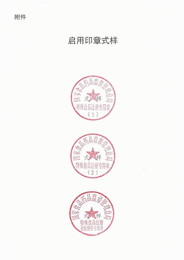 根据《保健食品注册与备案管理办法》(国家食品药品监督管理总局令第22号)、《特殊医学用途配方食品注册管理办法》(国家食品药品监督管理总局令第24号)和《婴幼儿配方乳粉产品配方注册管理办法》(国家食品药品监督管理总局令第26号),自2017年8月1日起,启用“国家食品药品监督管理总局特殊食品注册专用章(1)”用于保健食品注册,“国家食品药品监督管理总局特殊食品注册专用章(2)”用于特殊医学用途配方食品和婴幼儿配方乳粉产品配方注册,“国家食品药品监督管理总局特殊食品注册检验抽样专用章”用于特殊食品抽样。