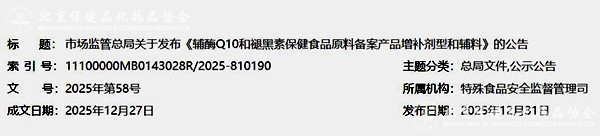 根据《中华人民共和国食品安全法》《辅酶Q10等五种保健食品原料备案产品剂型及技术要求》,市场监管总局制定了《辅酶Q10和褪黑素保健食品原料备案产品增补剂型和辅料》,现予公告,自2026年3月1日起实施。